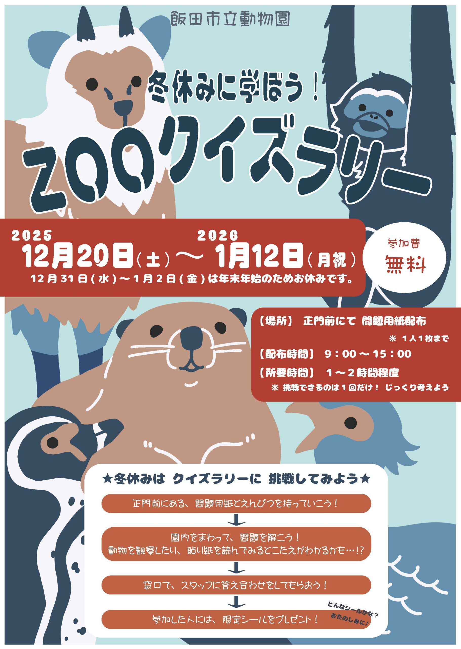 今年の冬休みも、園内をじっくりまわりながらクイズを解いていくIIDAZOOクイズラリーを開催します!